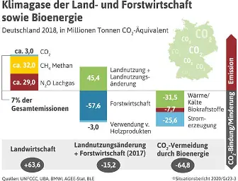 Der Landwirtschaft werden insbesondere Emissionen von Lachgas N2O aus der Düngung und von Methan CH4 aus der Tierhaltung zugerechnet. Entsprechend beliefen sich laut den Zahlen des Umweltbundesamtes die direkten Emissionen aus der Landwirtschaft im Jahr 2018 geschätzt auf 64 Millionen Tonnen CO2-Äquivalenten und damit auf 7 Prozent der gesamten Treibhausgasemissionen in Deutschland.