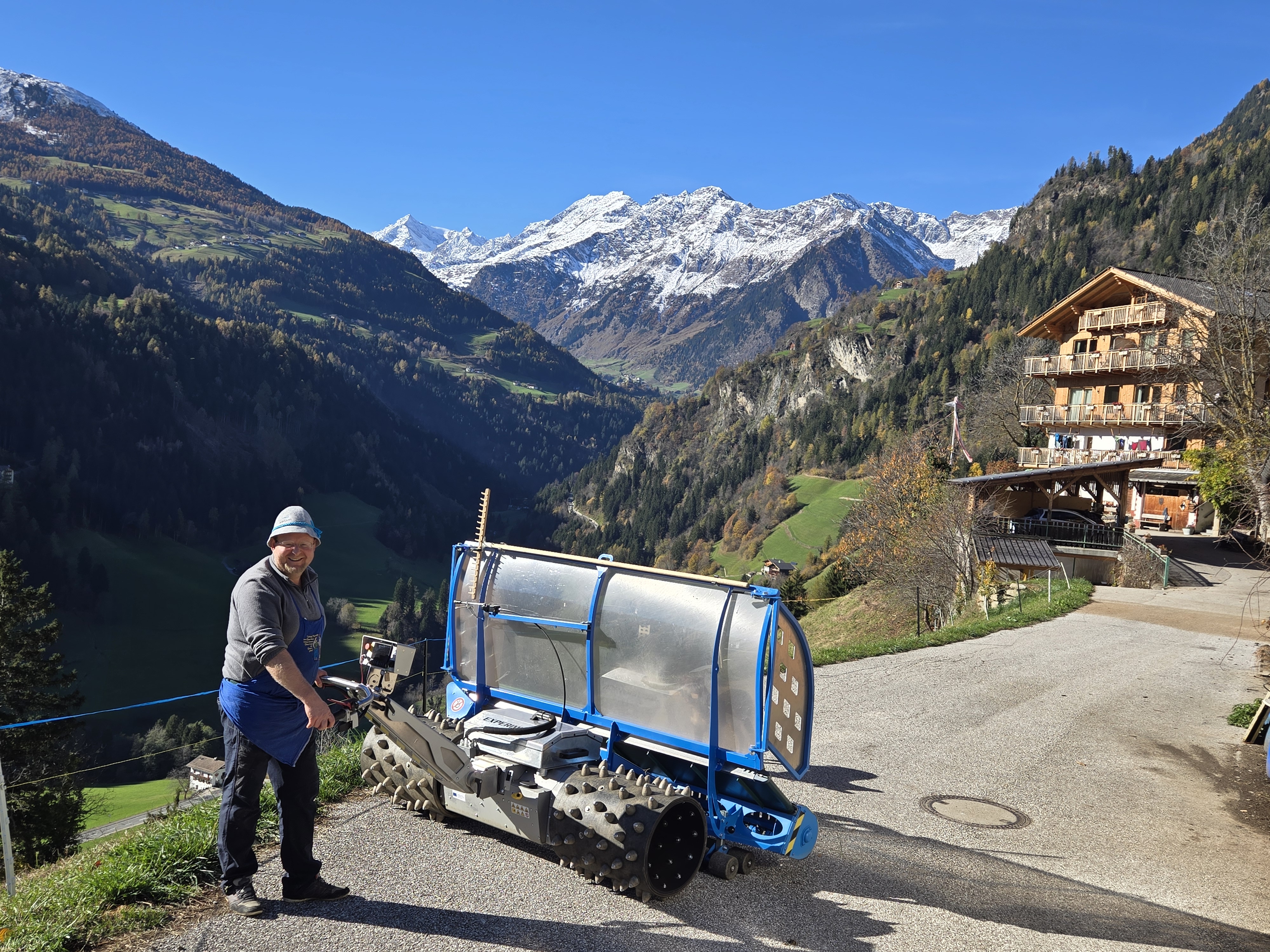 Seit 2024 wird das Heu nicht nur mit dem elektrischen Heuschieber an Ort und Stelle gebracht, sondern zuvor mit dem eMäher emissions- und quasi geräuschfrei gemäht. Selbst die teils beachtlichen Höhenunterschiede auf den Bergwiesen lassen sich mit den elektrisch angetriebenen Maschinen bewältigen. Die Akkus werden nachmittags mittels der PV-Anlage wieder aufgeladen.
