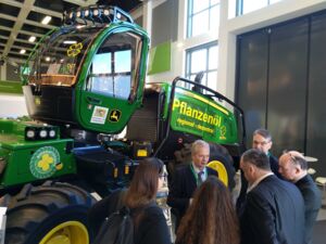 Das zentrale Ausstellungsstück und eines der größten Exponate der diesjährigen Messe ist der Holzvollernter 1270G von John Deere Forestry aus Finnland, dem Partnerland der Grünen Woche 2019. Eine vergleichbare Maschine wurde im Rahmen eines gemeinsamen Forschungs- und Entwicklungsprojekts unter der Federführung des Technologie- und Förderzentrums (TFZ) in Straubing von den Bayerischen Staatsforsten, dem John Deere European Technology Innovation Center (ETIC) und den Donauwald Forstmaschinen auf Rapsölkraftstoff umgerüstet und getestet. Gefördert wurde das Projekt vom Bayerischen Staatsministerium für Wirtschaft, Landesentwicklung und Energie. Die Ergebnisse liegen nun vor: Innerhalb 12 Monate leistete der Harvester 1.700 Betriebsstunden im Rapsölkraftstoffeinsatz. Die Produktivität ist auf gleichem Niveau wie im Betrieb mit Dieselkraftstoff. 33.500 Liter Dieselkraftstoff wurden ersetzt. Dazu kann der Harvester durch den Biokraftstoffeinsatz rund 100.000 kg Treibhausgasemissionen einsparen. Durch kleinere Modifikationen, wie die Beheizung der Tankzuleitungen, kann der Harvester auch bei im Wintereinsatz üblichen Minus-Temperaturen eingesetzt werden.