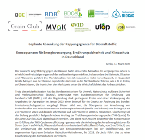 Berlin, 14.03.2023. In der aktuellen Diskussion über Klimaschutz im Verkehr veröffentlichen zehn Verbände der Agrar- und Energiewirtschaft ein gemeinsames Positionspapier, in dem sie vor den Konsequenzen einer Absenkung der Obergrenze für Biokraftstoffe warnen. Dies würde negative Folgen für Klimaschutz, Kraftstoffversorgung, heimische Futtermittelproduktion und landwirtschaftliche Fruchtfolgen sowie die Bioökonomie nach sich ziehen, mahnen die Verbände.