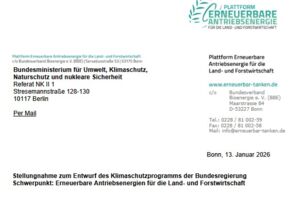 Die Plattform „Erneuerbare Antriebsenergie für die Land- und Forstwirtschaft“ hat bei der Bundesregierung eine Stellungnahme zum zu erarbeitenden Klimaschutzprogramm eingereicht. Im Rahmen der diesbezüglichen Öffentlichkeitsbeteiligung fasste die PEALF diverse Maßnahmenvorschlägen für den Ausbau erneuerbarer Antriebsenergien in der Land- und Forstwirtschaft zusammen.