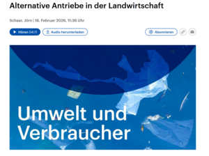Der Beitrag mit dem Titel „Alternative Antriebe in der Landwirtschaft“ beleuchtet zentrale Aspekte und Perspektiven nachhaltiger Antriebslösungen im Agrarsektor. Sie finden Beitrag unter: https://www.deutschlandfunk.de/alternative-antriebe-in-der-landwirtschaft-100.html